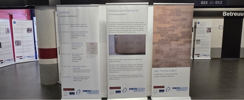 Vom 07.01. bis einschließlich 23.01. gastiert die Ausstellung „we, the six million“ am AEG. Die Ausstellung befasst sich mit den Geschichten von Opfern des Holocaust speziell aus dem Rheinland. Entstanden ist die Ausstellung im Rahmen einer studentischen Hausarbeit an der RWTH in Aachen auf Basis der freigegebenen Entschädigungsakten. Aufgearbeitet und ansprechend gestaltet finden die Schülerinnen und Schüler viele Informationen und Geschichten zu Opfern des Holocausts auf 36 Rollups gegliedert in sechs verschiedene Themenbereiche.