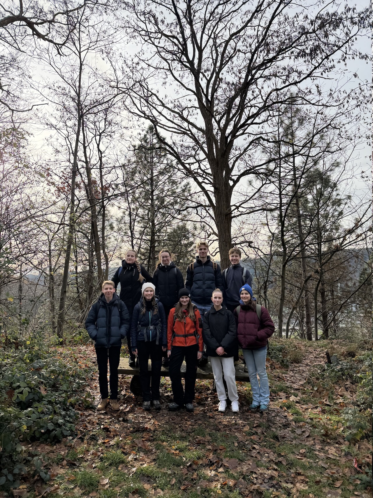Am 22.11.2025 fand unsere erste Tageswanderung im Rahmen der AG bergwärts statt. In Vorbereitung auf die im Sommer anstehende Alpenüberquerung ging es für uns um kurz vor 9 von Kaarst und Neuss aus nach Wuppertal. Da uns leider dort, zu Herrn Müllers Bedauern, die Schwebebahn im Stich ließ, wurde die Route kurzfristig etwas umgeplant und wir sind etwas früher gestartet. Zu elft haben wir dann knapp 22 Kilometer mit etwa 700 Höhenmetern geschafft und konnten auch die Auf- und Abstiege trotz gefrorenem Boden und frostigen 0° gut bewältigen. Da Herr Müller allerdings unbedingt noch Schwebebahn fahren wollte, sind wir dann nach 5 Stunden in diese eingestiegen, um uns auf den Rückweg zu machen, und waren am späten Nachmittag alle zurück. Auf dieser Wanderung konnten wir schon einmal unsere Leistungsfähigkeit, aber auch unseren Zusammenhalt auf die Probe stellen, aber auch die schöne Natur genießen.