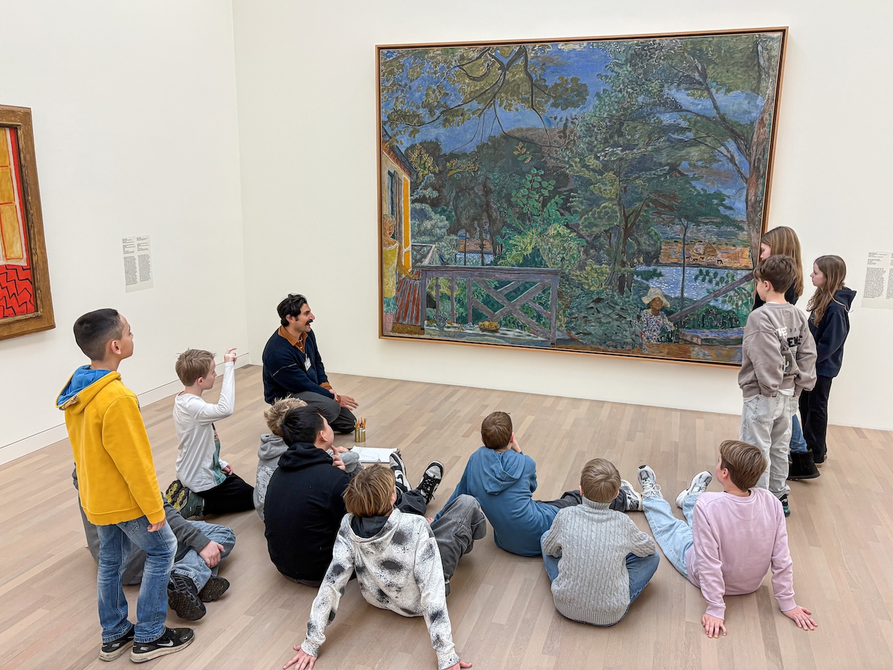Ausgehend von den Gemälden Paul Klees begaben sich die Kinder auf eine spannende Entdeckungsreise durch die Sammlung: Wo lassen sich Pflanzen, Wasser oder Tiere in Bildern finden? Welche Farben nutzen Künstlerinnen und Künstler, um Natur oder Stadt darzustellen? Und worin unterscheidet sich ein gegenständliches Landschaftsbild von einem abstrakten Gemälde? Anhand von Werken unter anderem von Etel Adnan, Pierre Bonnard, Georges Braque, Max Beckmann, Paul Klee, Marianne von Werefkin, Gerhard Richter und Wassily Kandinsky erfuhren die Schülerinnen und Schüler auf sehr anschauliche Weise, wie vielfältig Malerei sein kann.