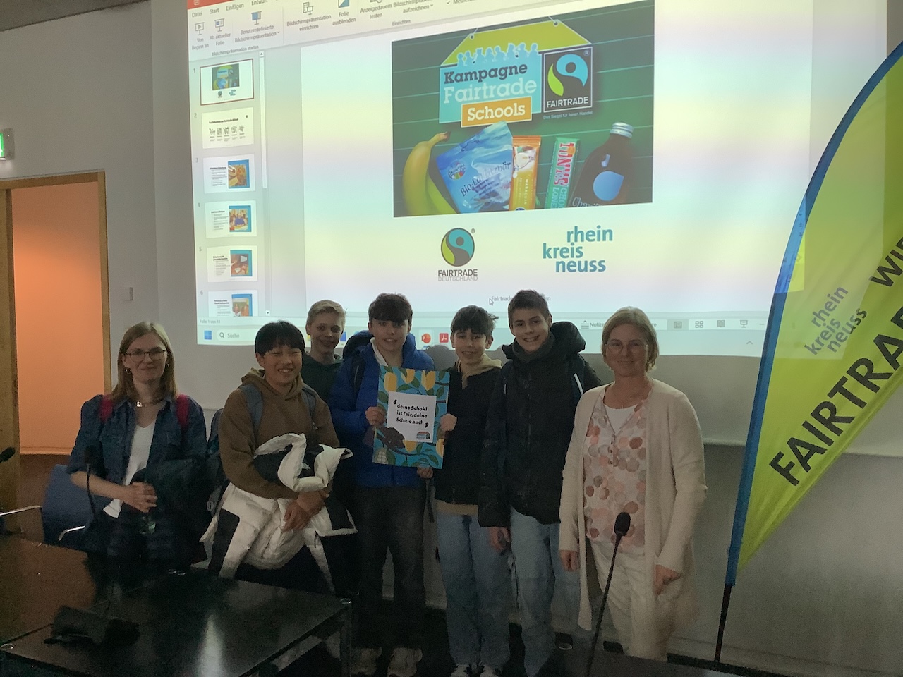 Am Montag, den 16.03.2026 fand im Kreishaus Neuss ein Fairtrade School Treffen statt. Hieran konnten alle Schulen teilnehmen, die bereits das Fairtrade School Siegel besitzen, oder eine solche werden wollen. Hauptthema war, sich untereinander auszutauschen und sich gegenseitig über Aktionen und Ideen dafür zu informieren. Die AEG-Fairtrade AG war komplett anwesend und hatte dafür eine Präsentation vorbereitet, die vorgestellt wurde. Es war sehr interessant zu sehen, wie andere Schulen das Thema „Fairtrade“ behandeln. Wir haben einige gute Anregungen mitgenommen. Spannend war für uns auch der Raum, in dem das Treffen stattfand, nämlich der Sitzungssaal im Kreishaus, wo jeder Platz mit einem Mikrofon ausgestattet ist. Wir hoffen, im Verlauf des weiteren Schuljahres als Fairtrade Schools in die Landesgartenschau in Neuss einbezogen zu werden.