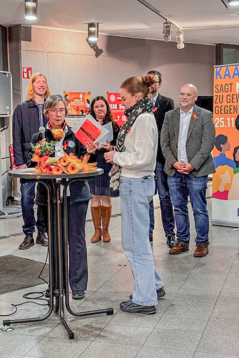 Die Schülerinnen und Schüler machten in ihren Arbeiten sichtbar, wie Gewalt Betroffene im Alltag prägt, und wie wichtig Solidarität, Bewusstsein und Prävention sind. Ihre Werke waren eindrucksvoll, klar und engagiert und stießen auf großes Interesse bei den Besucher:innen.