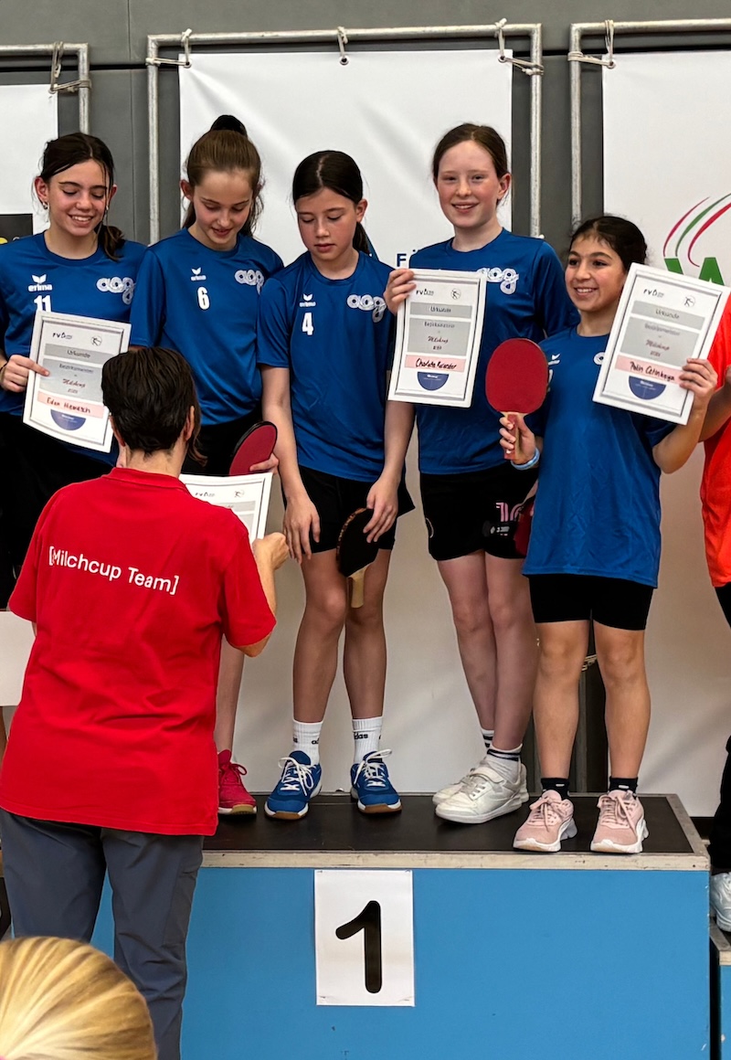 Bei den Jungen waren die Gegner für Alex, Frederik, Malte, Tim und Leonard aus der 6a zu stark, aber Charlotte, Eden, Emilia, Mira und Pelin gewannen Runde für Runde , so dass sie schlussendlich in das Finale einzogen. Das AEG ist stolz auf unsere Spielerinnen: Sie haben im Wettkampf der Klassen 5 und 6 den 1. Platz erspielt.