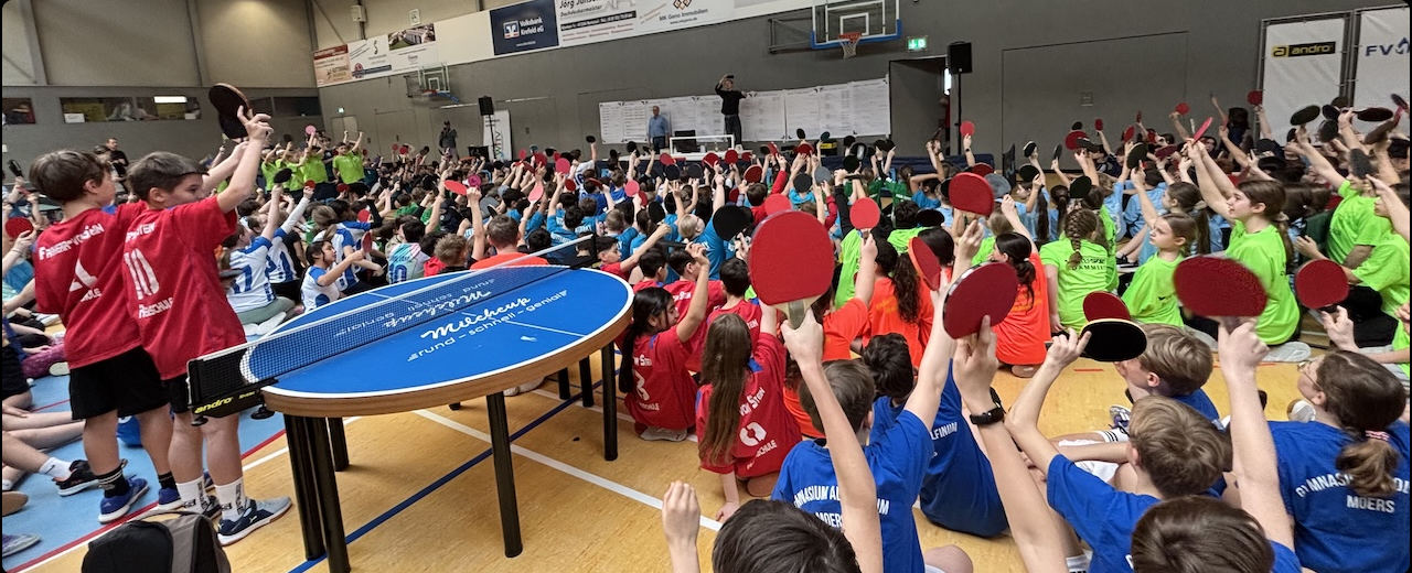 Es tummelten sich unzählige Tischtennisspieler*innen der 3. bis 6. Klassen, die im Rundlaufspiel gegeneinander antraten, was perfekt organisiert war. Zunächst wurde sich eingespielt, dann wurde an 11 Platten parallel gekämpft, was von offiziellen Schiedsrichterinnen gerichtet wurde.