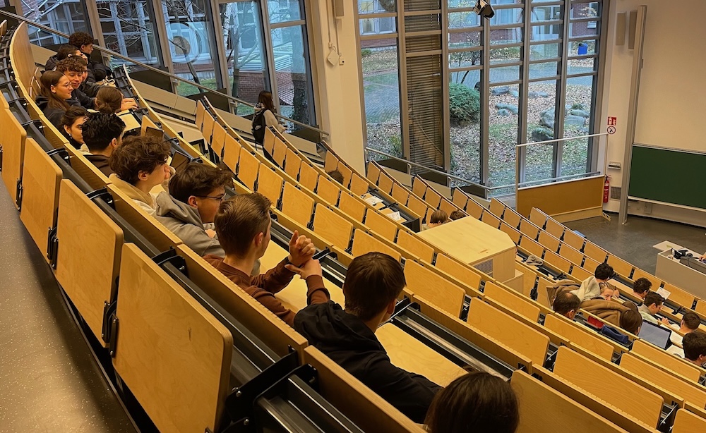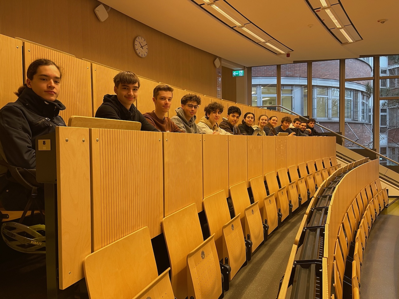 Der Tag startete mit einer Mechanik-Vorlesung zum Sonnensystem. Die Schüler:innen empfanden den Inhalt als interessant und anspruchsvoll, lobten aber gleichzeitig die ordentliche und verständliche Struktur der Darbietung. In der Vorlesung wurden die schulischen Grundkenntnisse vertieft und mathematisch untermauert. Auch schauten wir uns den Übungszettel an, den die Studierenden wöchentlich bearbeiten, um die Inhalt der Vorlesung nachzuarbeiten.
